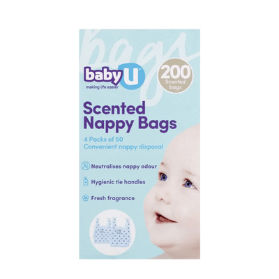 The specially formulated baby powder fragrance used in the babyU Nappy Sacks neutralises dirty nappy odours. Hygienic tie handles tightly seal in wetness and bacteria, making change time convenient, safe and clean.