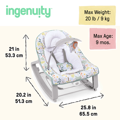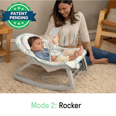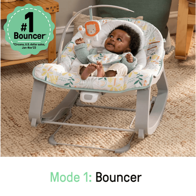 Third party tested and approved, the Keep Cozy features 3 modes in 1: bouncing, rocking, or convert it to a stationary seat for your toddler with the kickstand at the rear. Packed with features like soothing vibrations powered by 1 C battery (not included), two reclining positions for baby’s comfort and a removable infant bolster that helps newborns sit securely. Includes a detachable plush lion hanging toy for playtime at home or on the go.