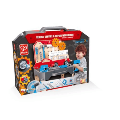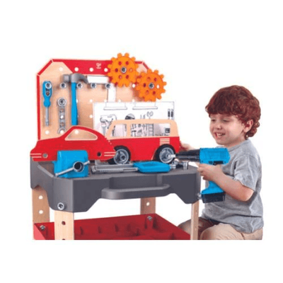 The set includes a workbench, which doubles as a box for storage, and a full set of tools: hammer, electric drill (requires 2xAA batteries, not included), saw, vice, two gears, L-square, wrench, screwdriver, tape measure, four tires, two car bodies, a cardboard garage scene, and some nuts and bolts.