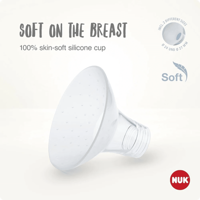 The NUK Soft & Easy Breast Pump features a 100% skin-soft silicone breast cup with no hard plastic, offering exceptional comfort and a gentle pumping experience.