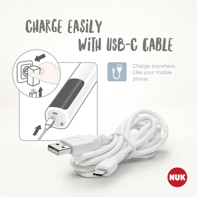 - 1x 150ml NUK Perfect Match baby bottle with teat and closing disc, USB-C cable, 1x adapter for NUK First Choice baby bottles