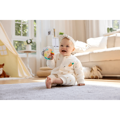 Mini tambourine to take with you on the goRing game and tambourine combined in one toyGrip, push and move in beat: this mini tambourine combines the best features of different materials. Promotes fine motor skills and helps concentrated listening for babies aged 3 months and over